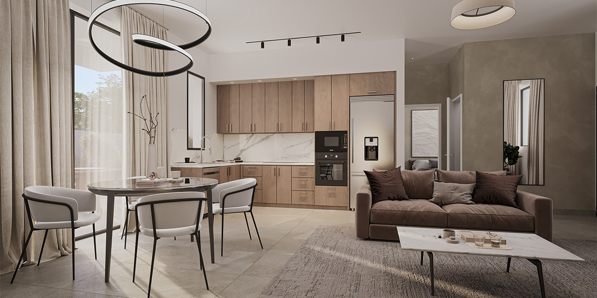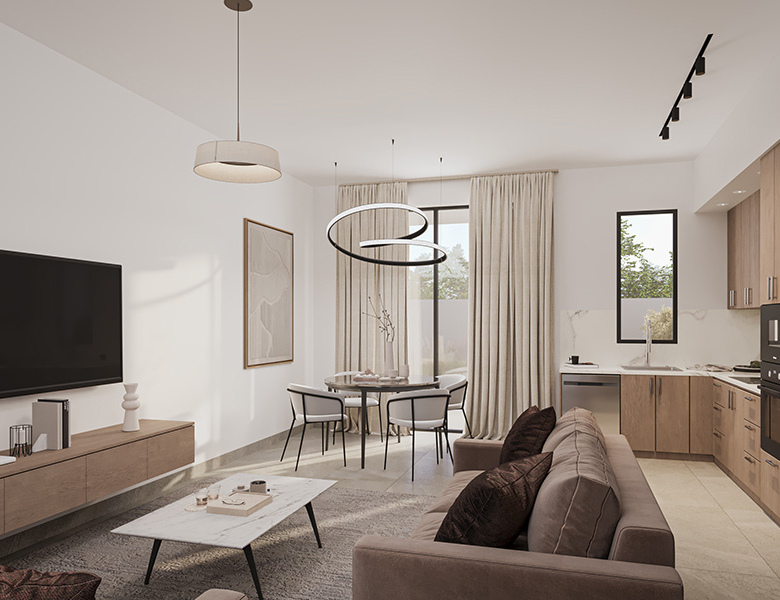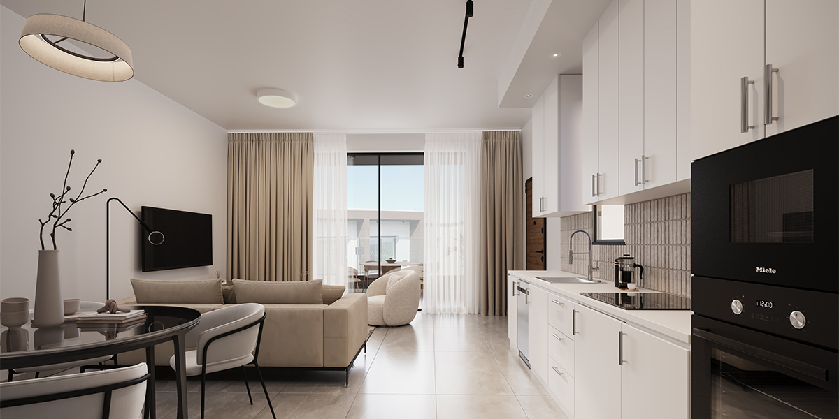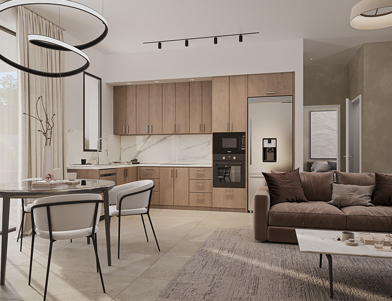 تستقبل الشقة سكانها بمنطقة معيشة رحبة ذات تصميم مفتوح، تمتزج فيها المساحات الداخلية بإضاءة طبيعية وفيرة بفضل النوافذ الكبيرة مزدوجة الزجاج. وقد جرى تجهيز المطبخ بخزائن مصممة حسب الطلب مع تشطيبات أنيقة ومجهزة لتوفير الاستخدام العملي اليومي بأعلى جودة