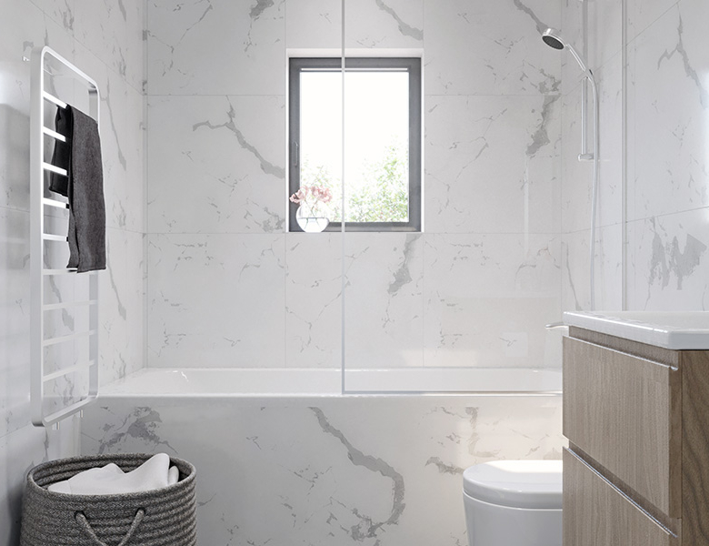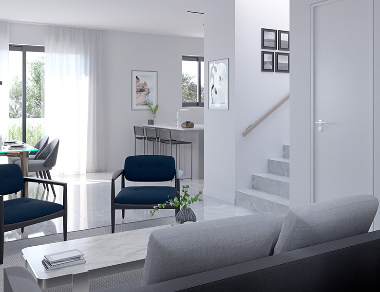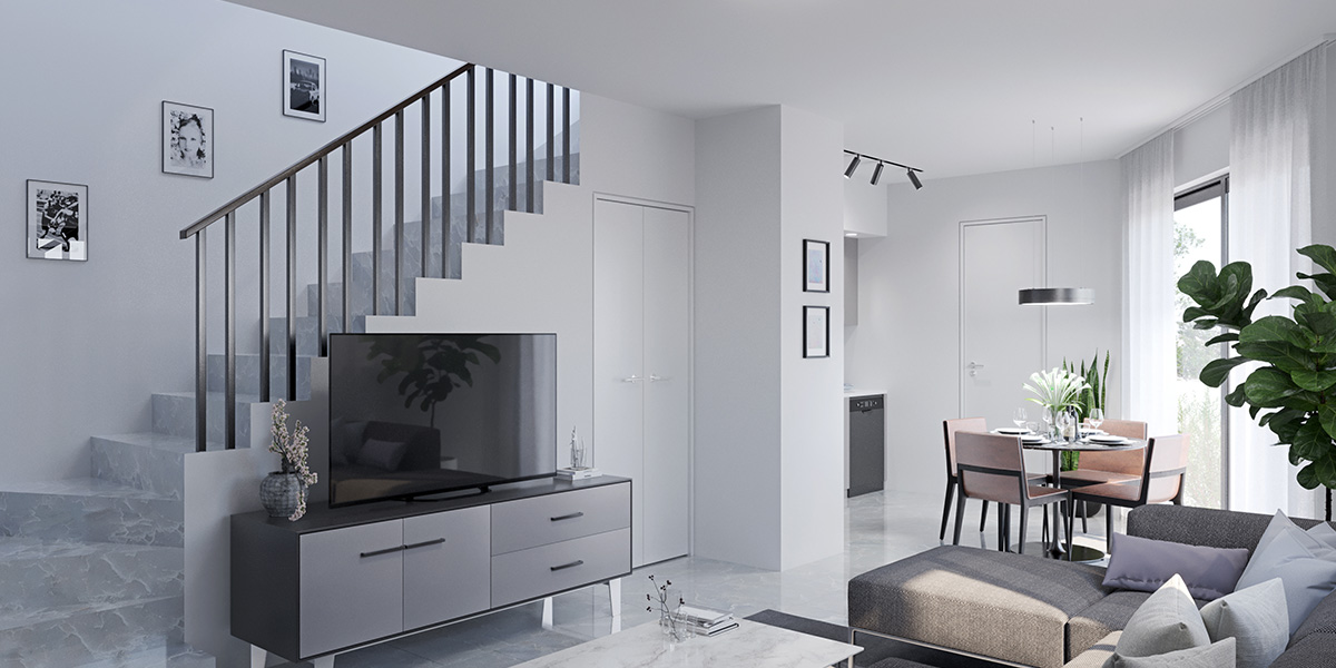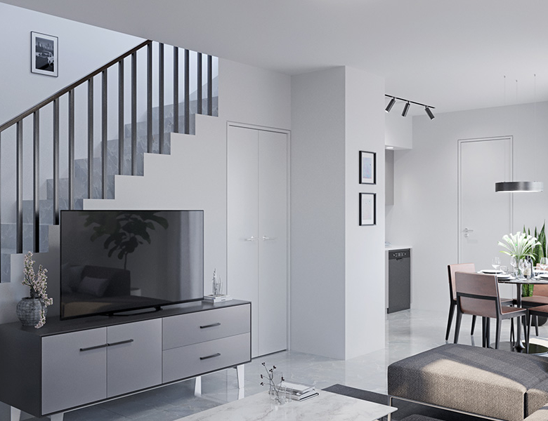 تستقبل الشقة سكانها بغرفة معيشة واسعة ومفتوحة، تتناغم فيها التصاميم العصرية مع الإضاءة الطبيعية الغنية التي تتسلل عبر نوافذ مزدوجة الزجاج تمتد من الأرض حتى السقف، مما يضفي شعورًا بالرحابة والانسجام مع الطبيعة المحيطة.