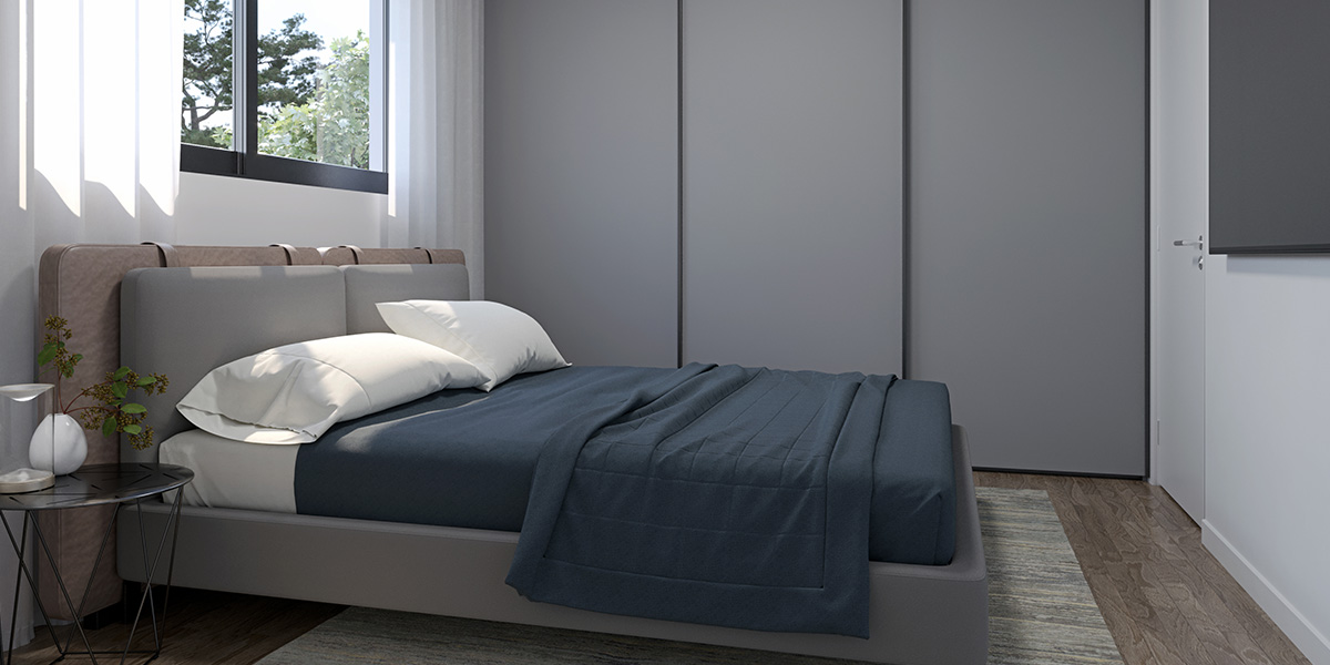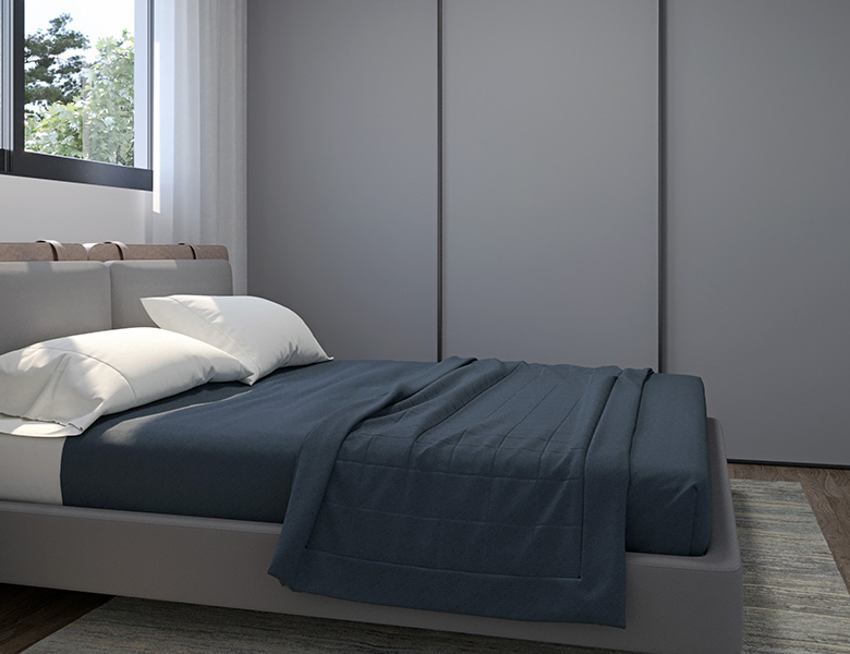 تضم الشقة غرفة نوم رئيسية راقية مع خزانة مدمجة فسيحة، وحمام فخم مزود بتشطيبات راقية وأجهزة صحية عصرية. الشرفة المغطاة تمثل امتدادًا مثاليًا للمساحات الداخلية، وتوفر إطلالة خلابة على المساحات الخضراء الهادئة المحيطة بالمجمع