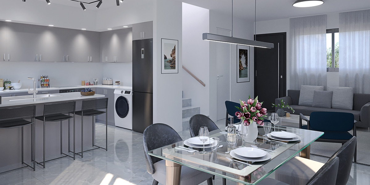 المطبخ مجهز بأحدث التصاميم، مع خزائن مصممة حسب الطلب وتشطيبات فاخرة، مجهز بالكامل لتلبية احتياجات الطهي اليومية بأناقة لا مثيل لها