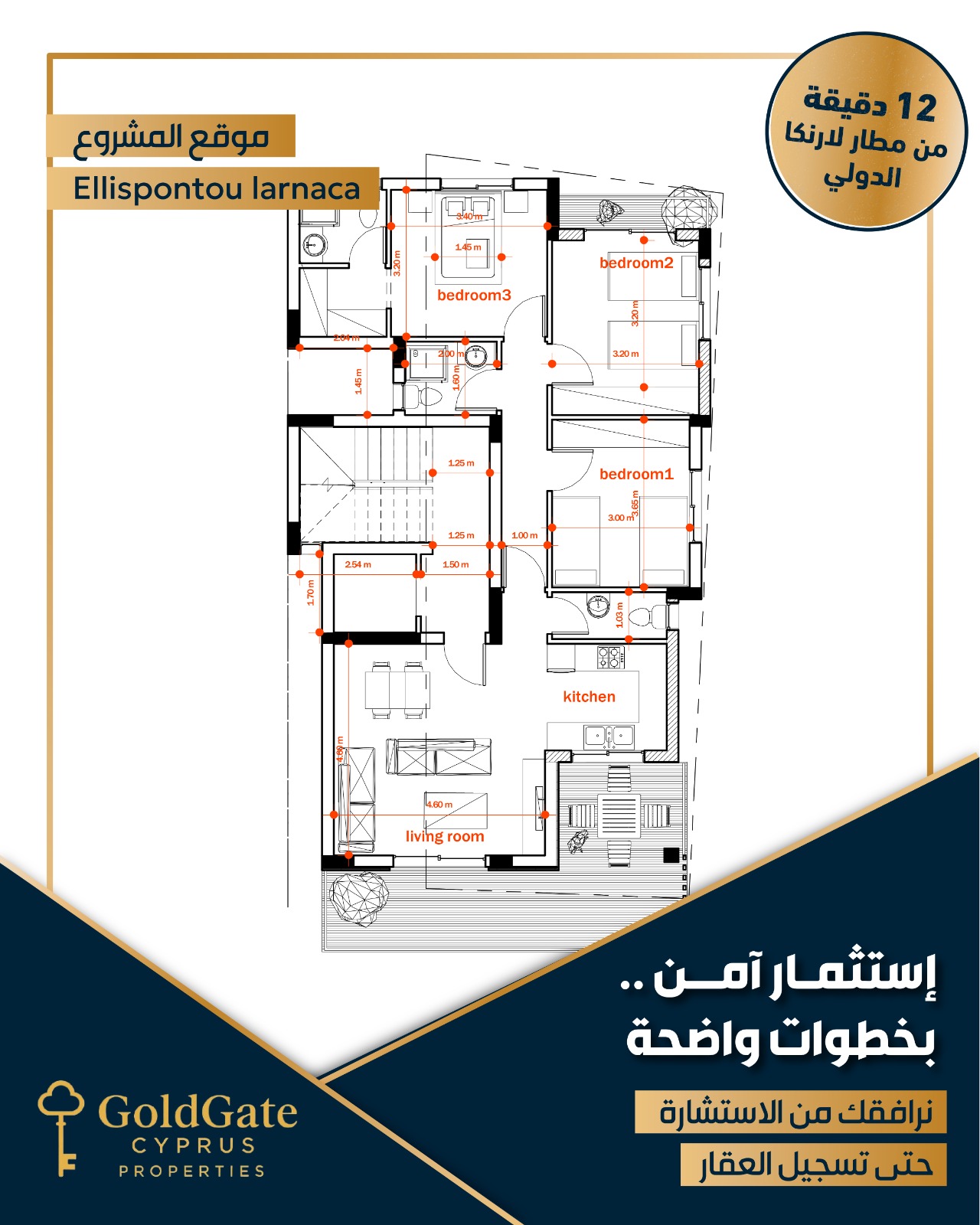 مساحة البيت 95متر مربع + 25 متر مربع بلاكين , يبعد ٨ دقائق من مركز المدينه و ١٢ دقيقه من مطار لارنكا الدولي