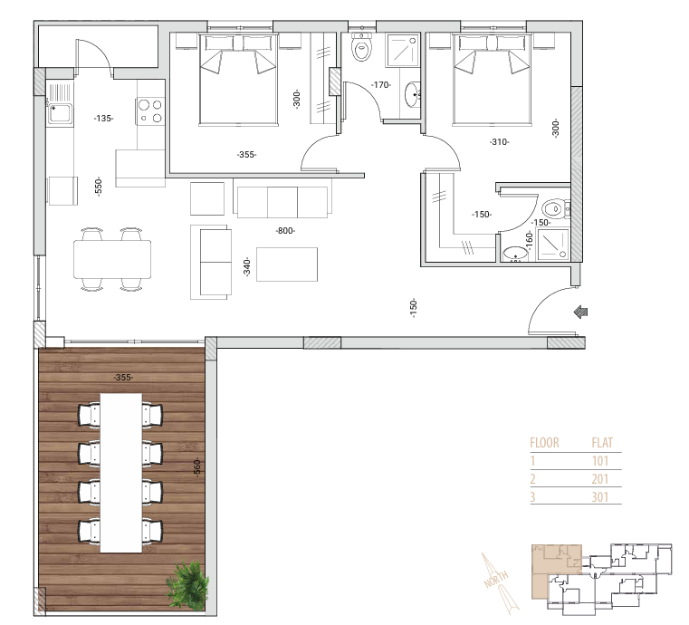الشقق مفروشة ومجهزة بالأجهزة الكهربائية. الشقق مبنية من مواد عالية الجودة، والأرضيات عالية الجودة، وأدوات المطبخ المصنوعة من الألمنيوم المصقول بمواصفات ممتازة.